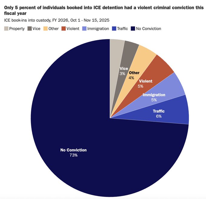 NEW data I've received: Just 5% of people detained by ICE since October 1 have had violent criminal convictions, 3/4 had no criminal convictions at all. Most "criminals" had immigration, traffic, and vice offenses. Not the "worst of the worst"...